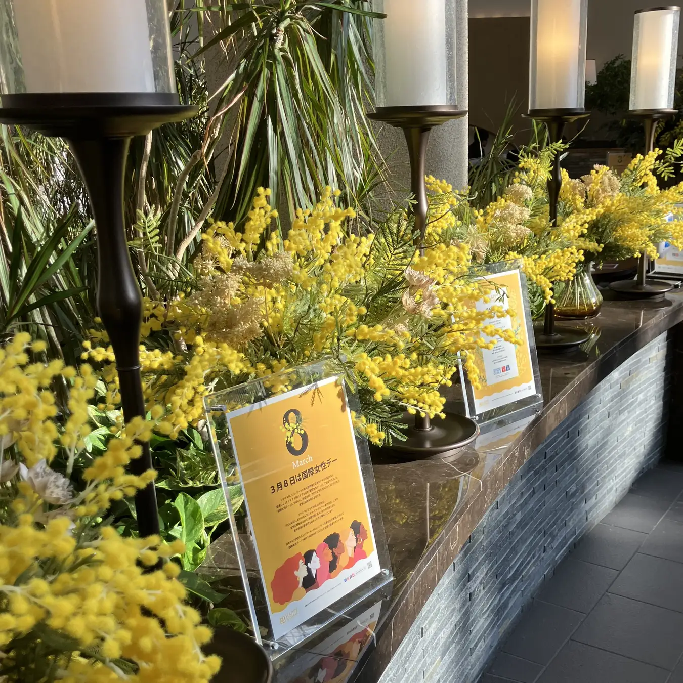 2026/3/1(日)~3/30(月)の期間中、ホテル内では国際女性デーのシンボルカラーである「幸せの黄色」のミモザの花で装飾し、華やかで春らしい雰囲気を演出しています。
